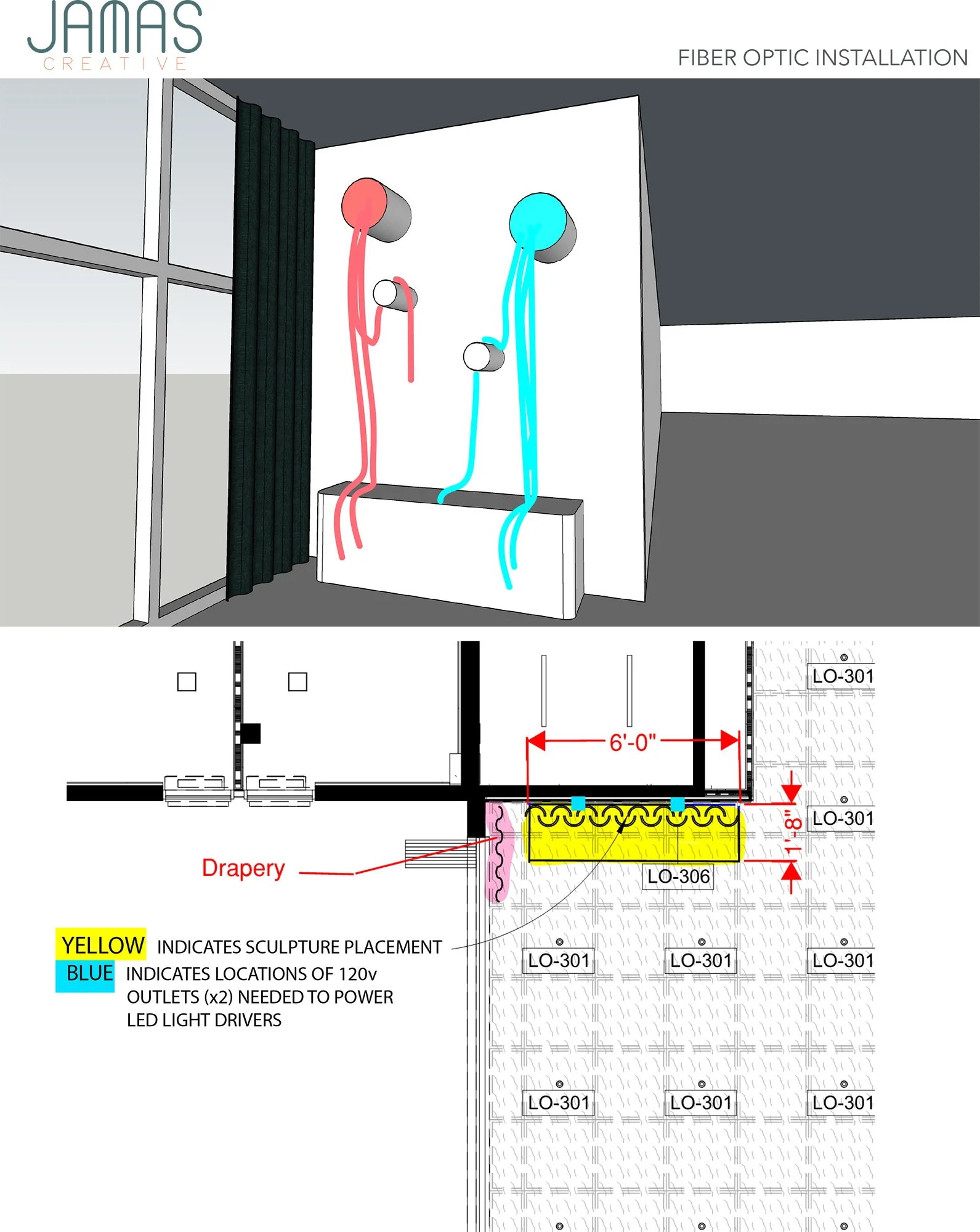CONCEPT DESIGN, FABRICATION, AND INSTALLATION OF A 6’ x 10’ FIBER OPTIC LIGHTING PIECE. SITUATED OVER A CUSTOM BENCH, AND MADE TO BE INTERACTED WITH BY GUESTS AND LOBBY PATRONS FOR PHOTO OPPORTUNITIES. FEATURING LEDrgb LIGHTING CONTROLLED VIA WiFi BY HOTEL EMPLOYEES.